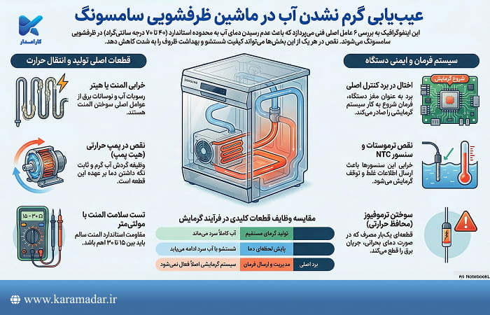 عدم افزایش دمای آب در چرخه شستشو ماشین ظرفشویی سامسونگ، یکی از اختلالات جدی است که علاوه بر کاهش کیفیت پاککنندگی، بهداشت ظروف را نیز به خطر میاندازد. آب گرم با دمای بهینه (بین ۴۰ تا ۷۰ درجه سانتیگراد) برای انحلال چربیها و ضدعفونی کردن محیط داخلی دستگاه ضروری است. این اختلال می تواند باعث کثیف ماندن ظروف یا بوی بد دستگاه شود. لذا در این مقاله می خواهیم دمورد علل و علائم گرم نشده آب ماشین ظرفشویی سامسونگ و راه حل های پیشگیری از آن را توضیح دهیم. این اختلال در می تواند در نقص در قطعات فنی و مکانیکی، عوامل محیطی و خارجی مورد بررسی قرار داد.